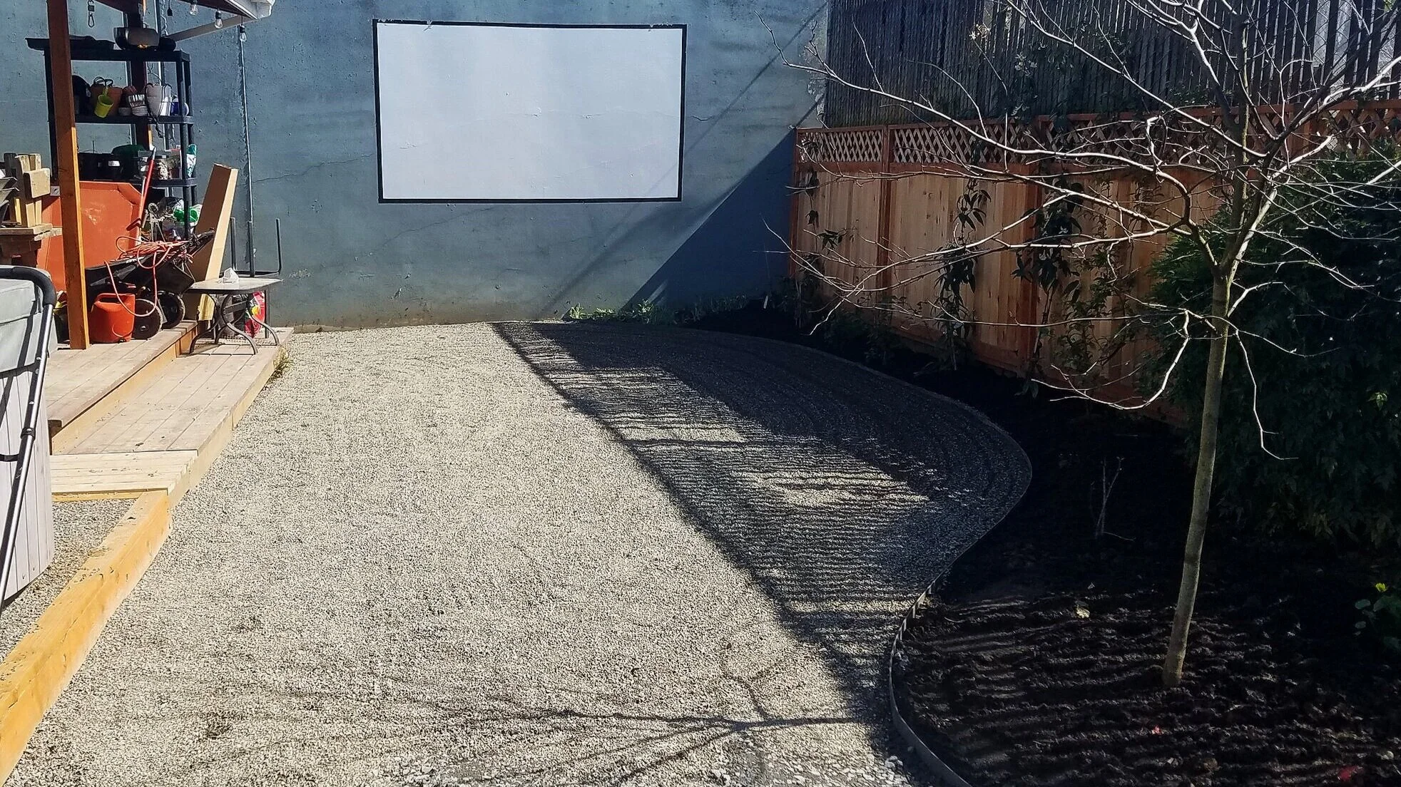 Lawn removal plus 4” compacted gravel, 1” 1/4-10 top dressing gravel, welded steel border for planting beds, and Silver Falls Oregon stone for office patio and steps. Excellent design by the clients.